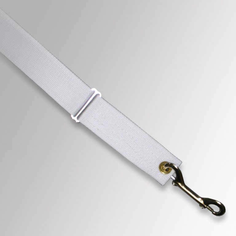 Non-slip reverse web slide with double ended snap. Made from heavy-duty 2″ polyester white web and nickel plated web slides and snap.