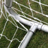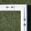 Front face is made from 3” round custom aluminum extrusion with a durable white powder coated finish. Backstays are constructed of 2” round heavy wall aluminum tubing. Frame has double-reinforced, TIG-welded corners and stainless-steel hardware. The included 4mm white net installs easily with the frame’s built-in net clip track and net clips. Ground anchors keep the goals in place during windy conditions and powerful kicks.