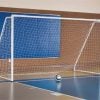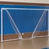 Frame measures 6.5’ high x 12’ wide and 5’ deep. The goal goes up quickly and is easy to reposition and transport. Backstays fold inward and encourages compact storage and portability for indoor soccer.
