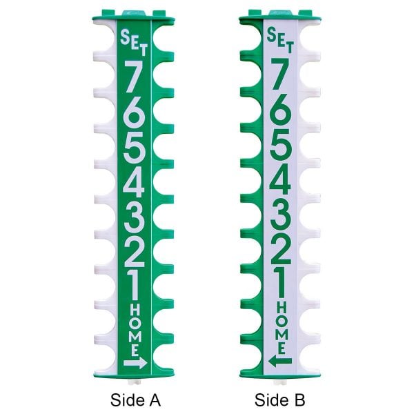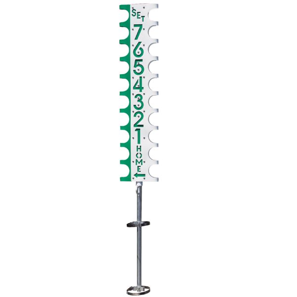 Manual tennis score keeper uses tennis balls to score matches with standard scoring allowing for (3) traditional sets or an 8-game pro set. Has an all-metal support that attaches to the net post with quick release hose clamps for easy court change over (no tools needed). Both games and sets won are displayed. Name cards mount on top of mast and are sold separately.